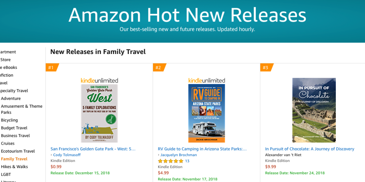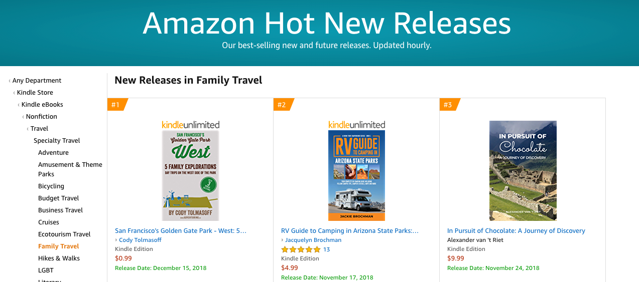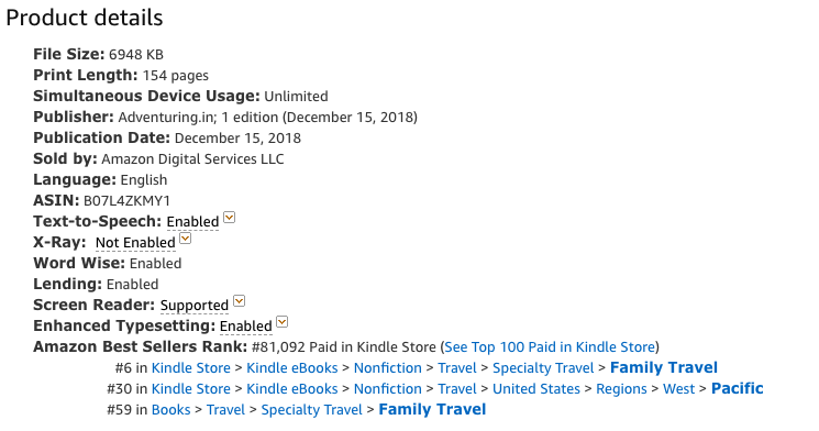 My book reached Number One! Somehow my first book made it to the #1 spot for Family Travel on Amazon's hot new releases. I'm pleasantly surprised, to say the least! Keep on reading First Book Published 06 Dec, 2018 Published - Adventures In Getting Out 20 Oct, 2019